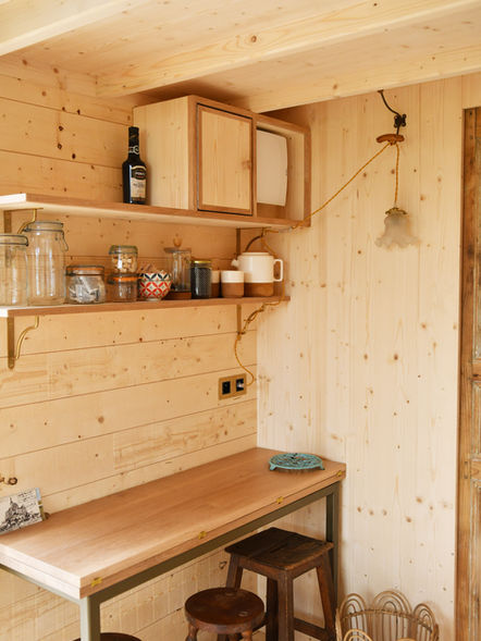 Elle dispose d'une cuisine et d'une salle de bain (avec toilettes sèches), une chambre en mezzanine pour 2 personnes ainsi qu'un lit confortable 1 personne dans le salon.